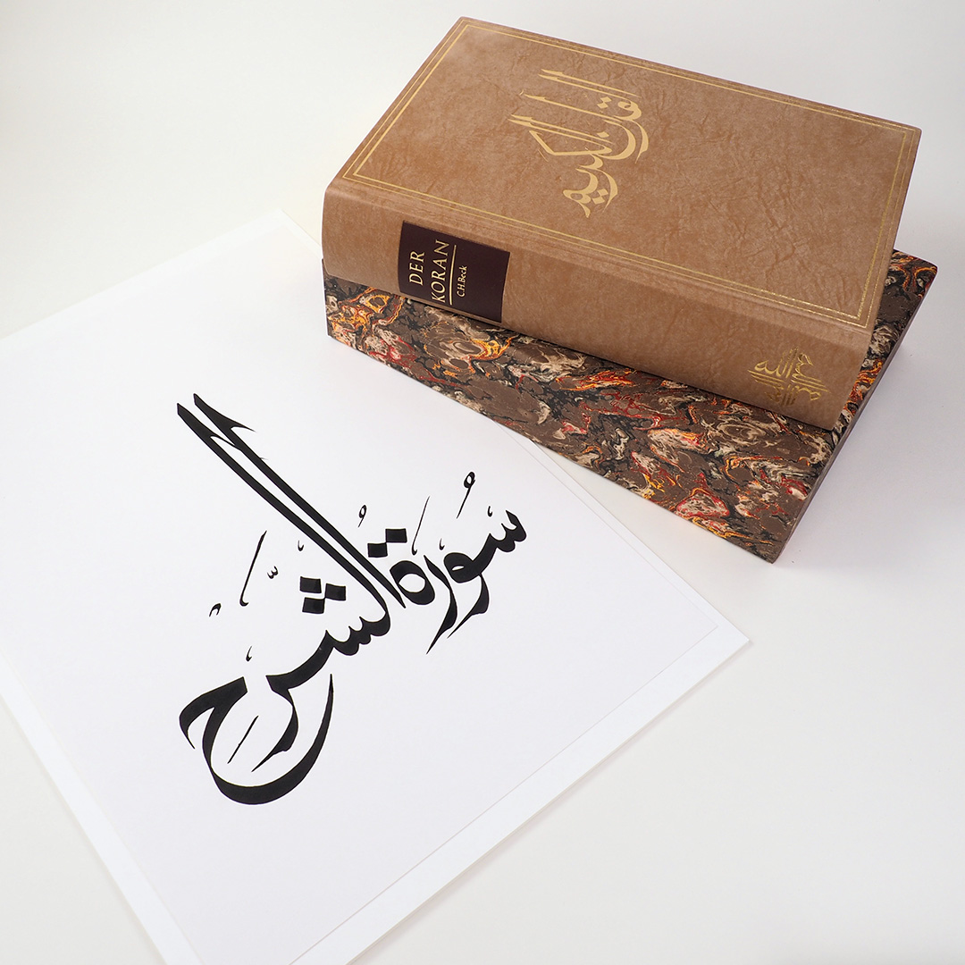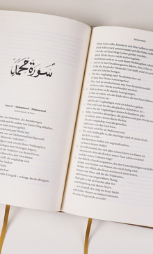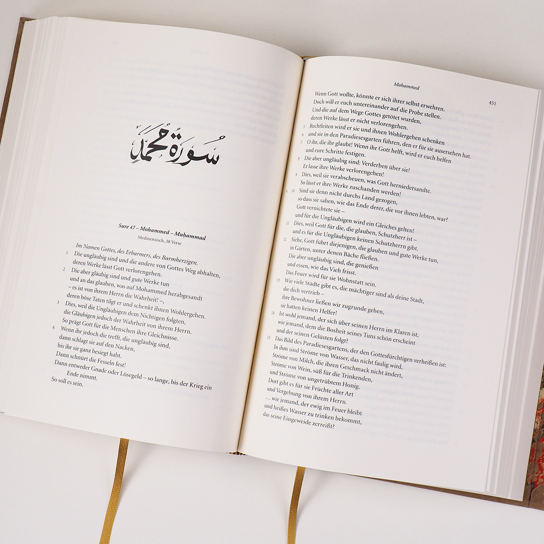 Diesen Ansprüchen wird für den Beck Verlag Hartmund Bobzin, Professor für Islamwissenschaft und Semitische Philologie an der Universität Erlangen, gerecht: Anmerkungen geben Hinweise, die auch für den nicht-wissenschaftlichen Leser verständlich sind, 120 extra angefertigte Kalligrafien des in Aachen lebenden Künstlers Shahid Alam illustrieren die in deutsche gefasste heilige Schrift auf moderne Weise."